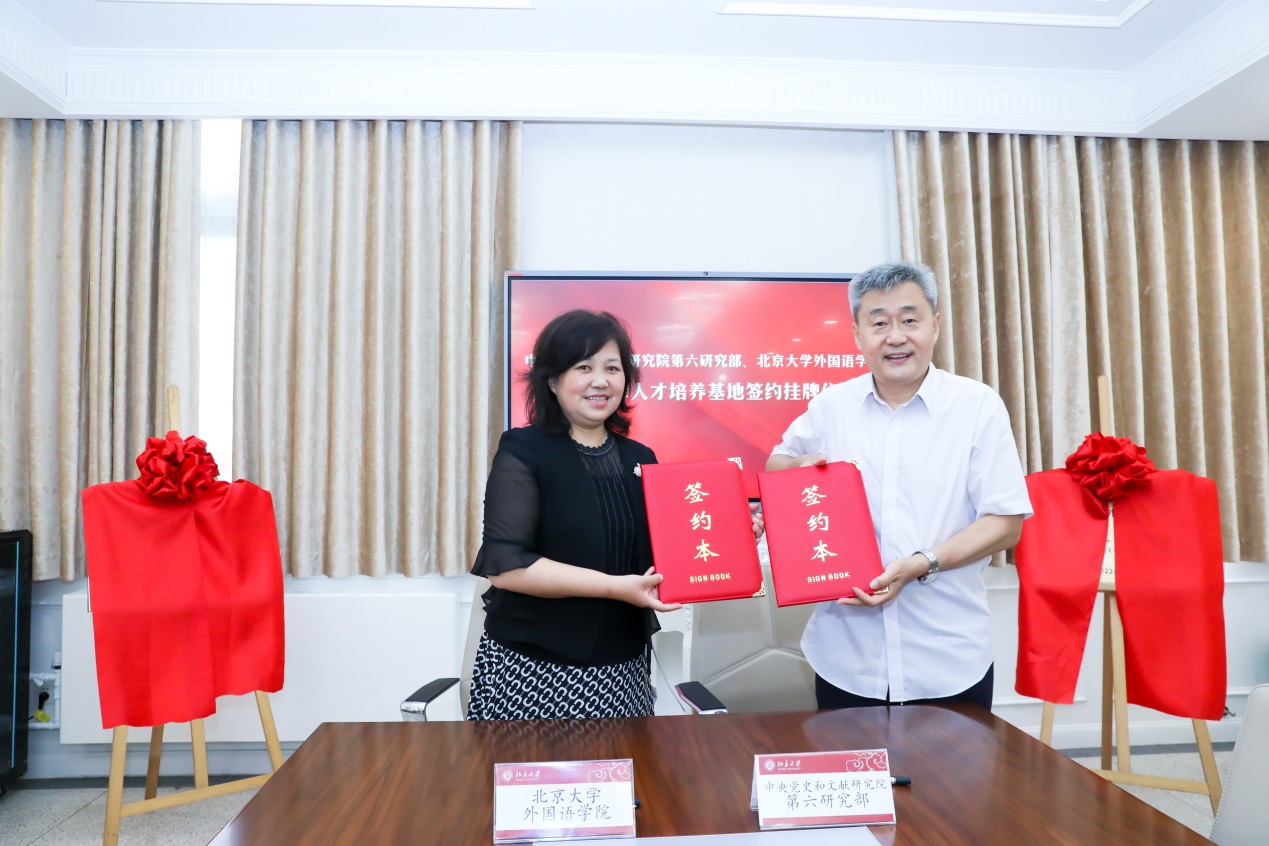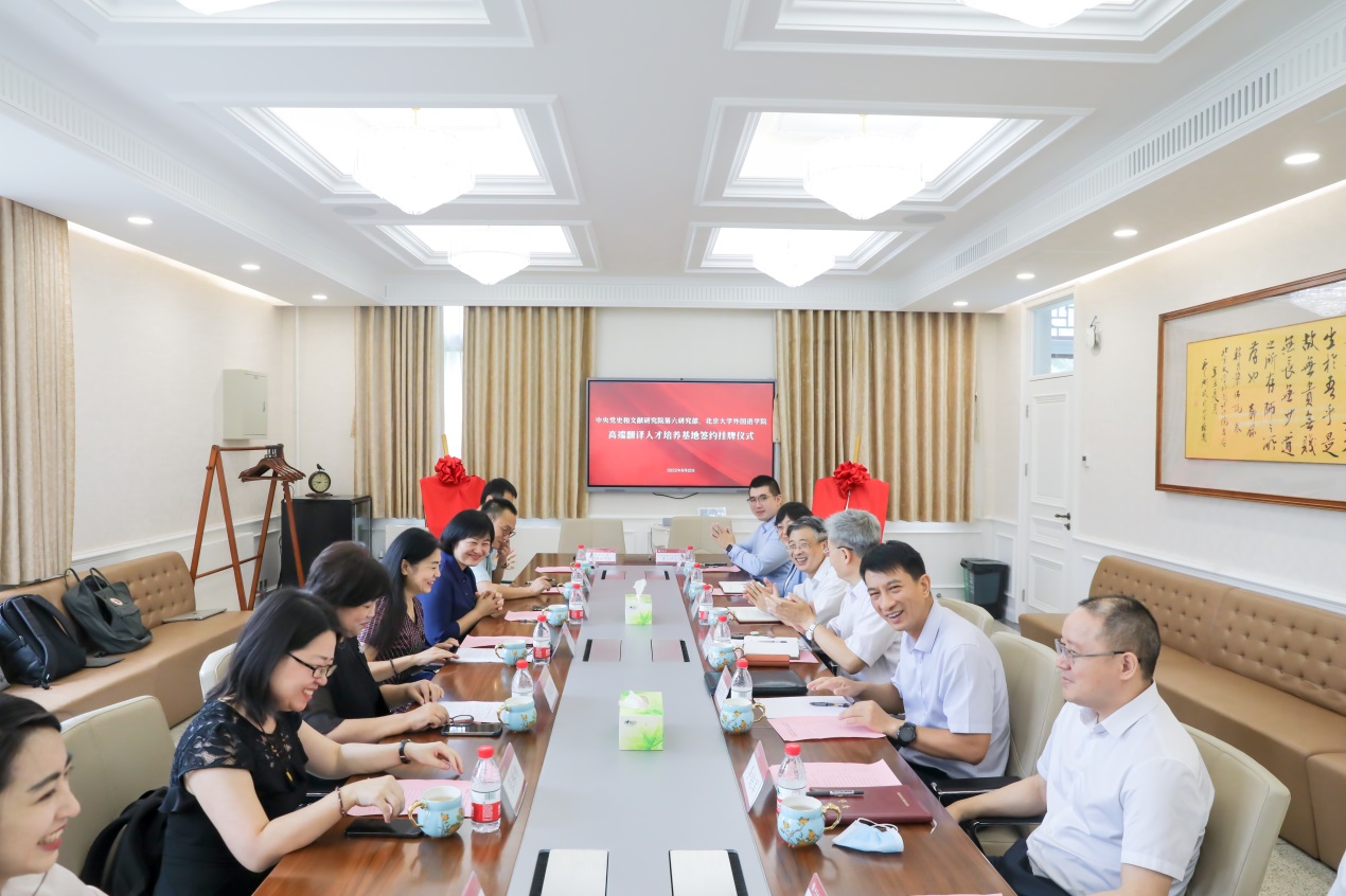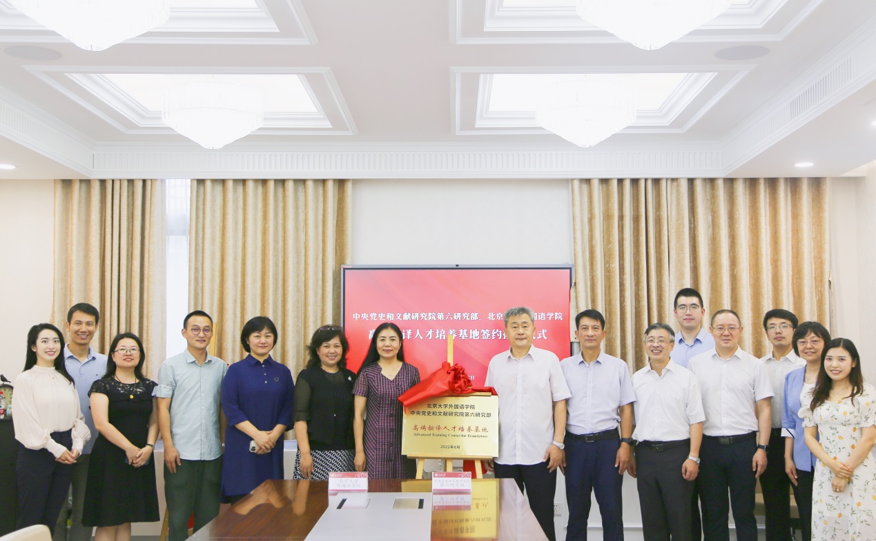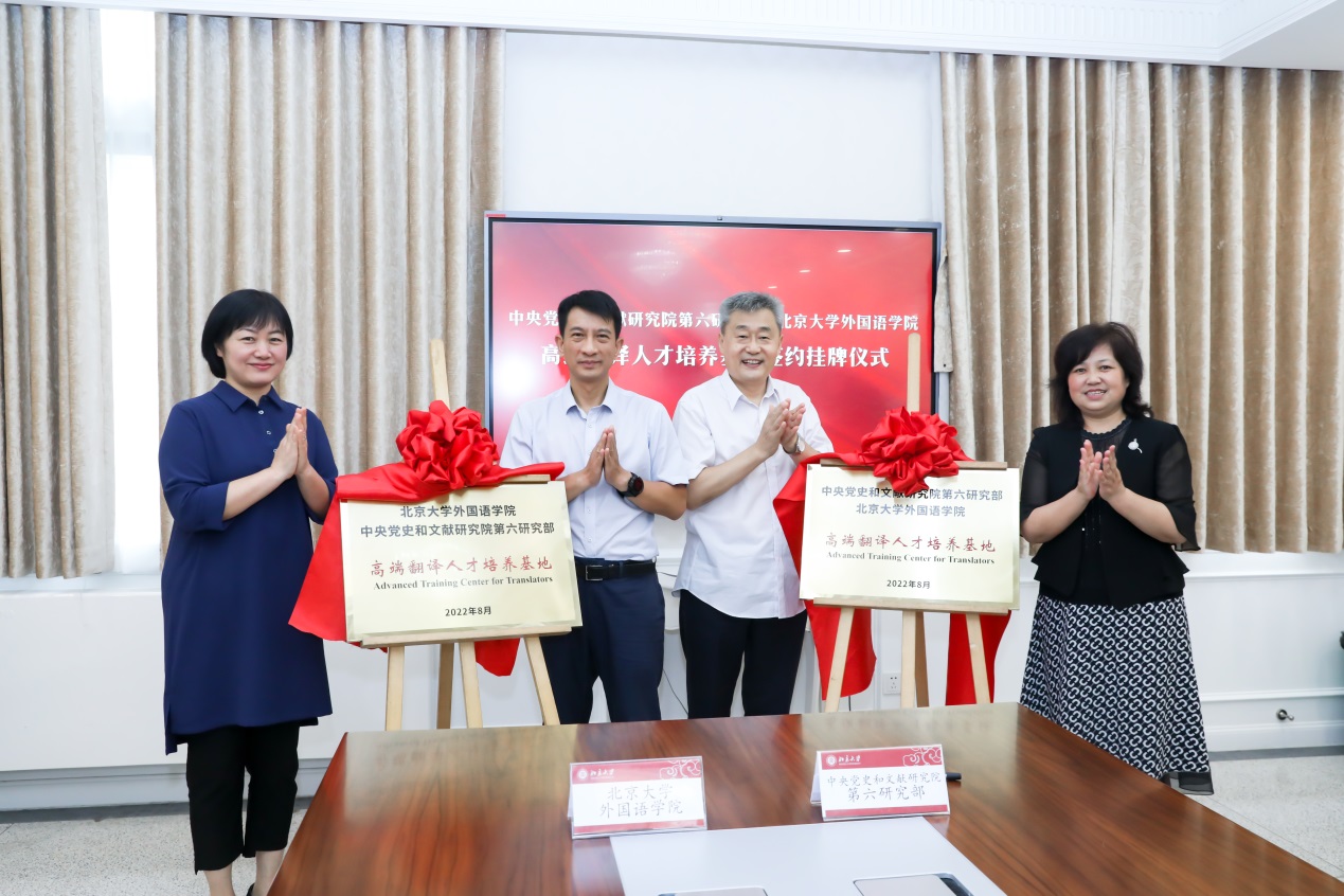 8月12日上午,“中央党史和文献研究院第六研究部 北京大学外国语学院高端翻译人才培养基地(Advanced Training Center for Translators)”签约及揭牌仪式在北京大学举行。中央宣传部国际传播局副局长陈雪亮、中央党史和文献研究院第六研究部主任张士义、北京大学副校长兼校党委组织部部长宁琦及两家单位领导班子成员出席,北京大学外国语学院党委书记李淑静主持。