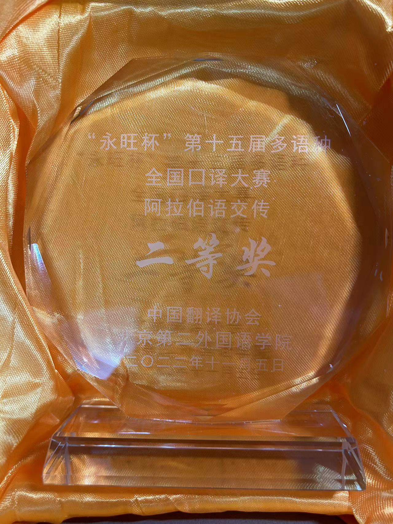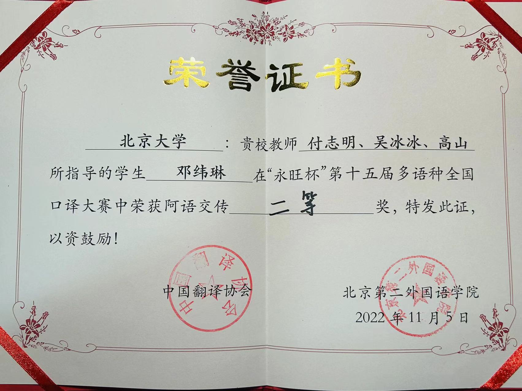 经过激烈角逐,北京大学外国语学院阿拉伯语系2020级硕士生邓纬琳荣获阿语交传二等奖。