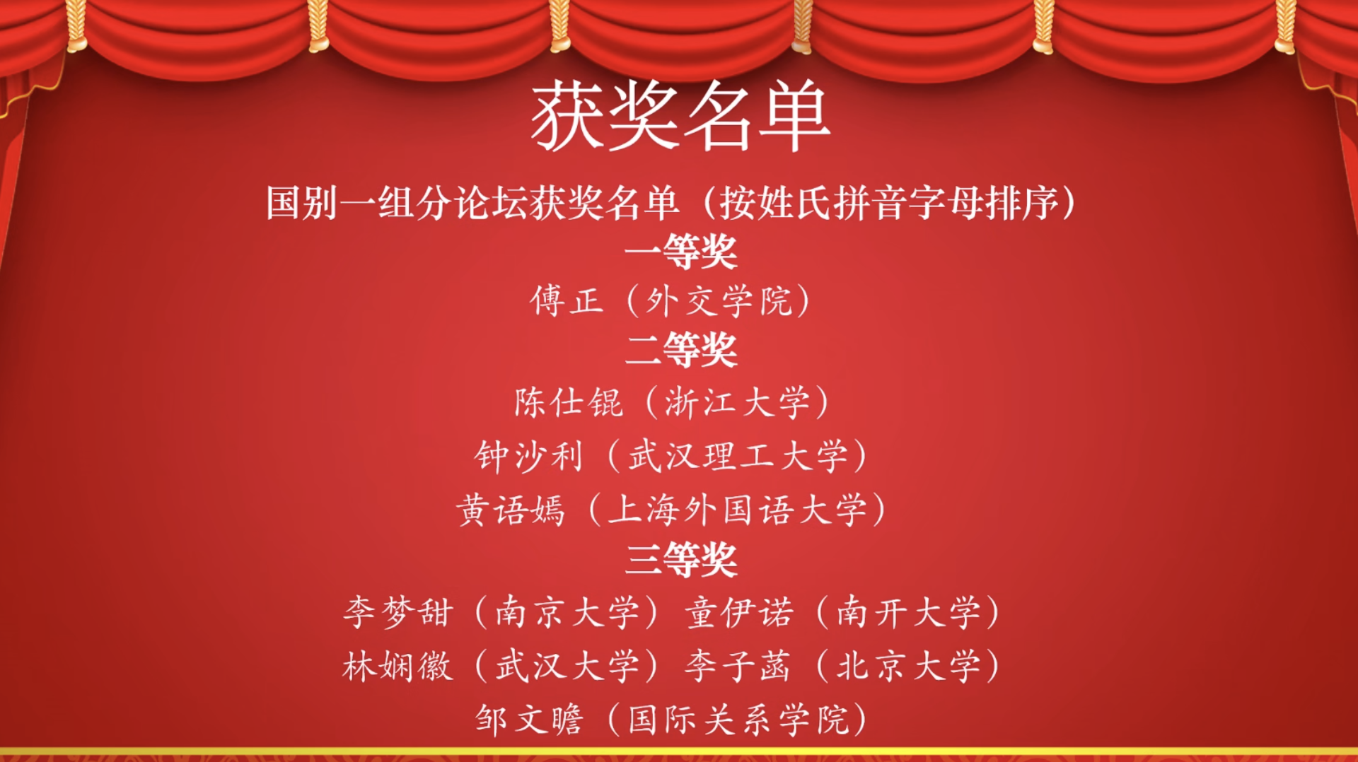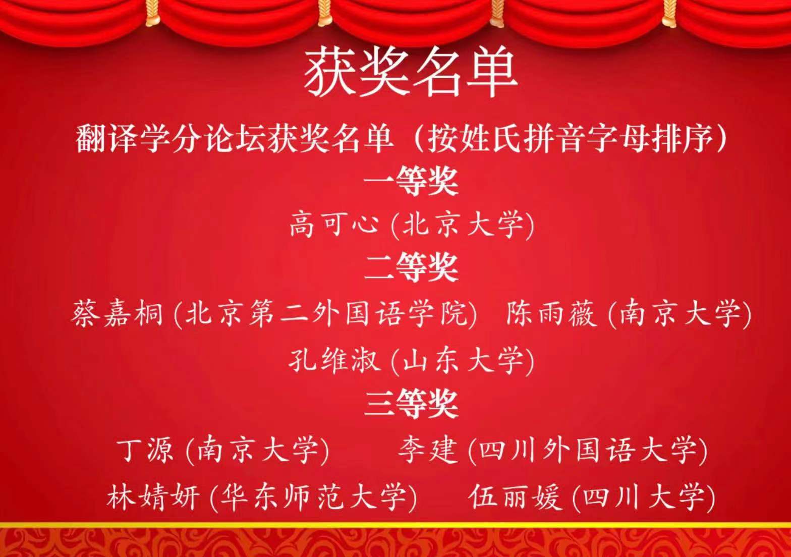 法语系2020级高可心(组员:郝元隆、齐洹呈)获得翻译学分论坛一等奖,她发言的题目是“二十世纪法文抽象名词的中文音译——以‘普罗列塔利亚’为例”(Usage et Evolution de la forme translittérée de noms abstraits du français en chinois: Prolétariat comme exemple);2021级李子菡(组员:金坤妍)获区域国别分论坛三等奖,她发言的题目是“加拿大法语资源的保护——对当代电影政策的研究”(Ressources de preservation de la langue française au Canada: étude sur les politiques cinématographiques contemporaines )。