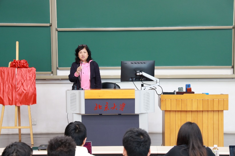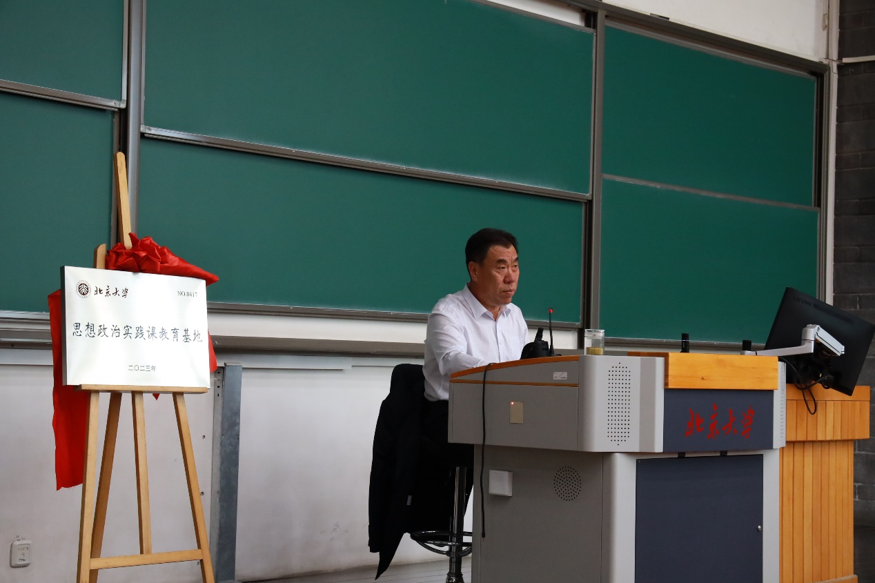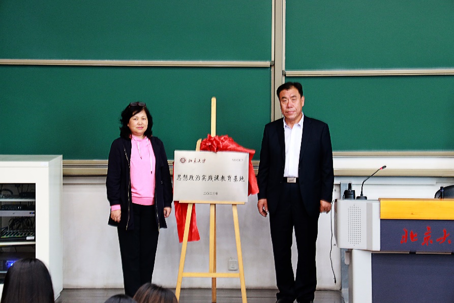 课前,李淑静和仉锁忠共同为北京大学外国语学院、北京市房山区窦店镇窦店村共建的“思想政治实践课教育基地”揭牌。窦店村位于北京西南38公里处,居住着汉、回、满、蒙四个民族。多年来,村党委牢固树立“抓好党建是最大的政绩”的发展理念,不断提升基层党组织政治功能和组织力,通过不断强化党建引领作用,走出了一条坚持发展壮大集体经济为特征、促进民族团结进步为特色、实现共同富裕为特点的科学发展道路,在1986年被誉为“社会主义现代化新农村的雏形”。村集体先后获得“全国先进基层党组织”“全国民族团结进步模范集体”“首批中国少数民族特色村寨”“全国文明村镇”等荣誉称号。2019年2月,窦店村被国家七部委评定为“首批国家农村产业融合发展示范园”。