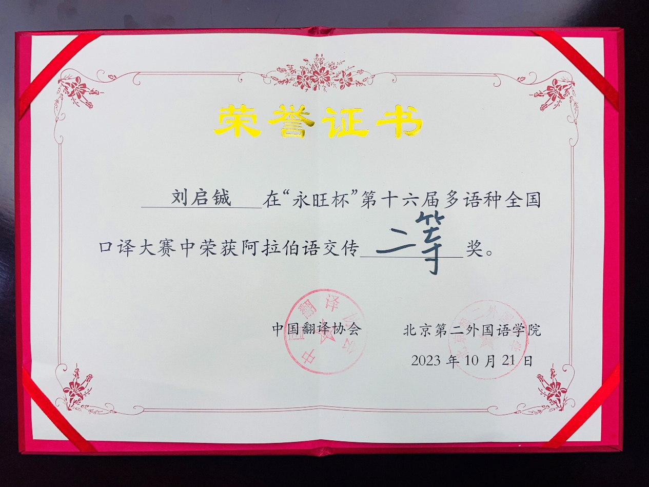 喜报:北京大学外国语学院阿拉伯语系刘启铖获“永旺杯”第十六届多语种全国口译大赛二等奖